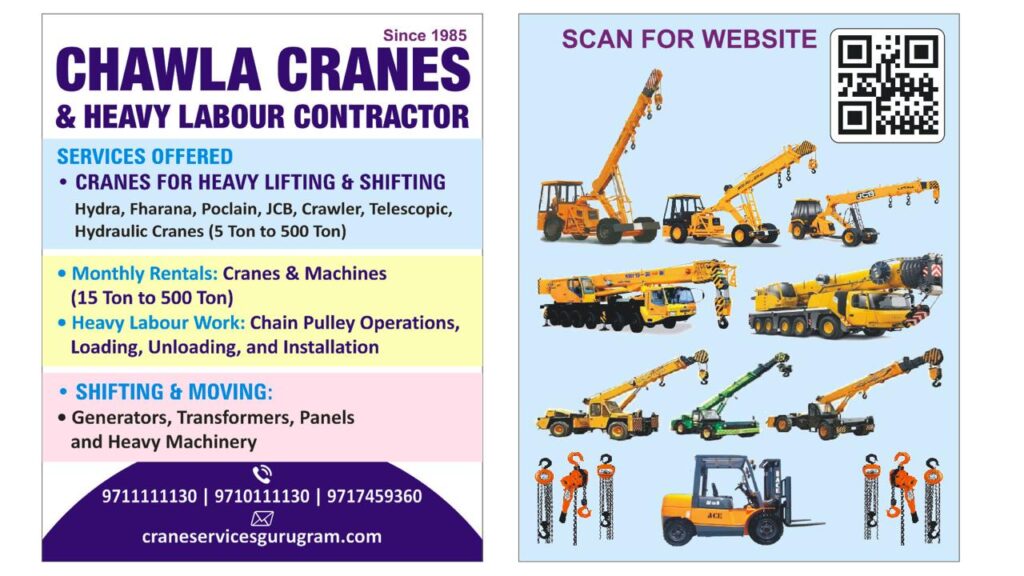 At Chawla Cranes & Heavy Labour Contractor, we focus on quality service, well-maintained equipment, and strict safety standards. Whether it’s construction work, factory shifting, or specialized lifting operations, we provide customized solutions to meet our clients’ requirements. Our commitment to professionalism and customer satisfaction has made us a trusted name in the industry.